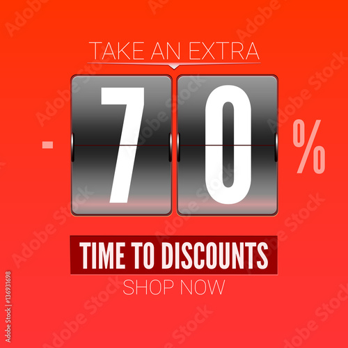 "Sale design for coupon. Time to discounts advertising sales on analog flip clock." Stock photo ...